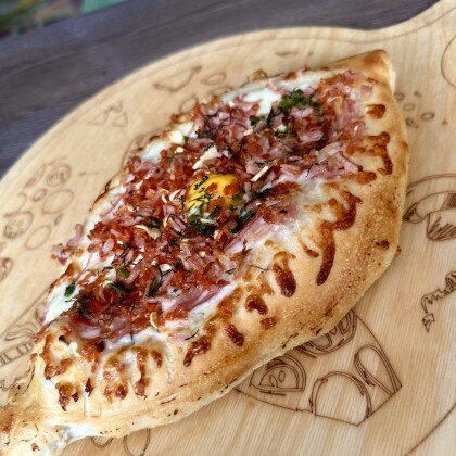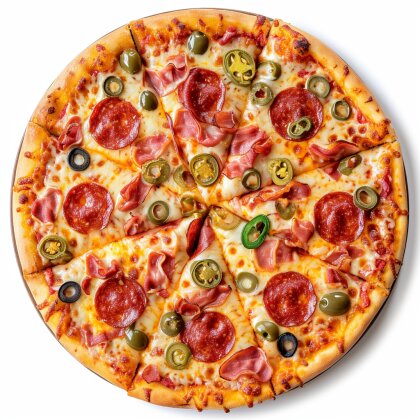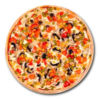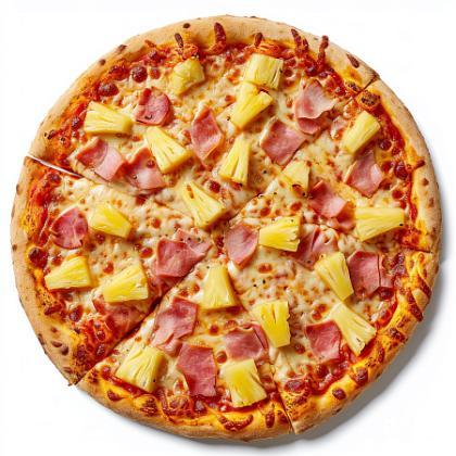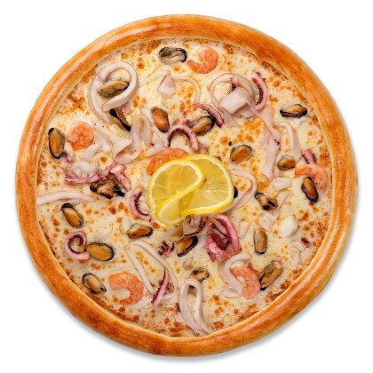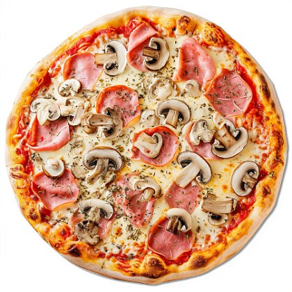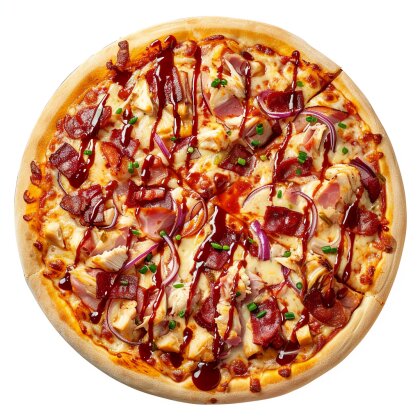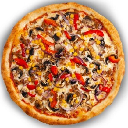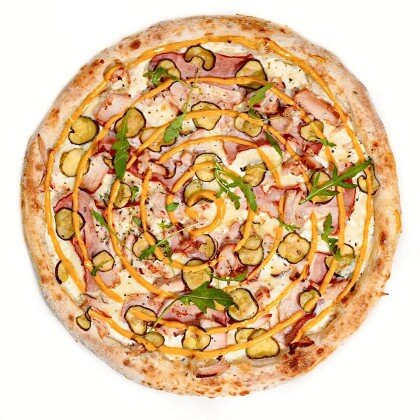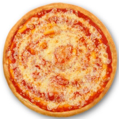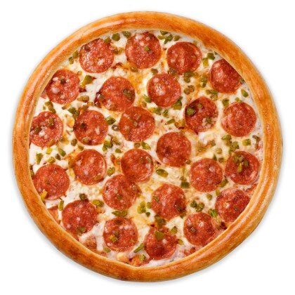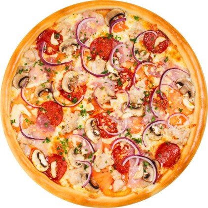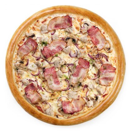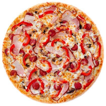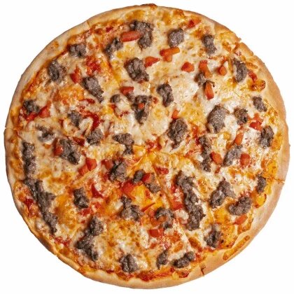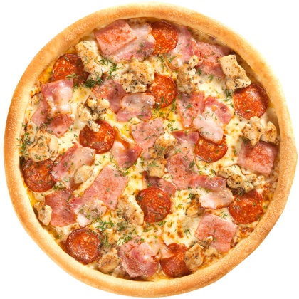 Соус томатный, ветчина, колбаски охотничьи, огурец солен., моцарелла, лук фри, масло чесночное
