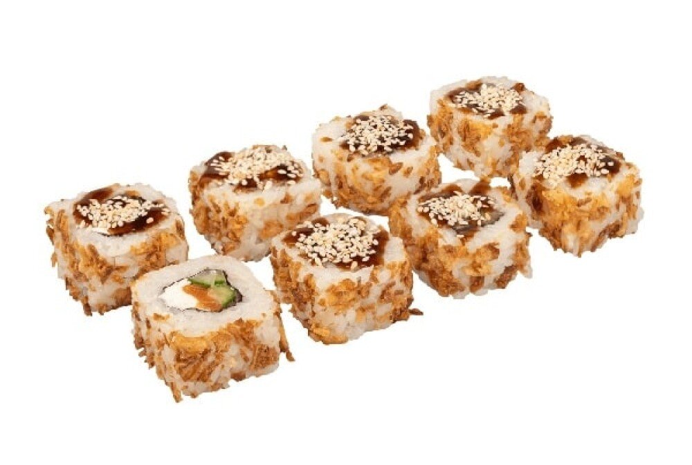 Рис, нори, сливочный сыр, тунец, огурец , лук фри