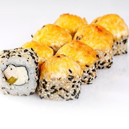 рис, нори, сливочный сыр, лосось, огурец , стружка тунца, сырная шапочка, соус унаги