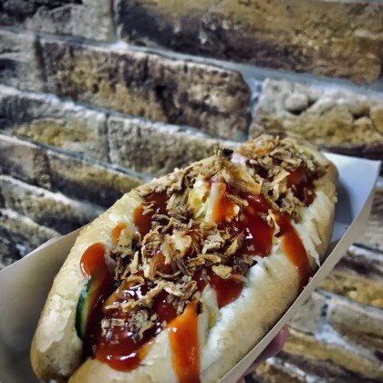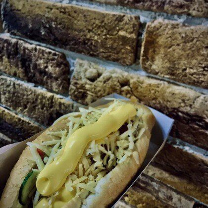 Булочка французская, колбаска говяжья, кетчуп, соус горчичный