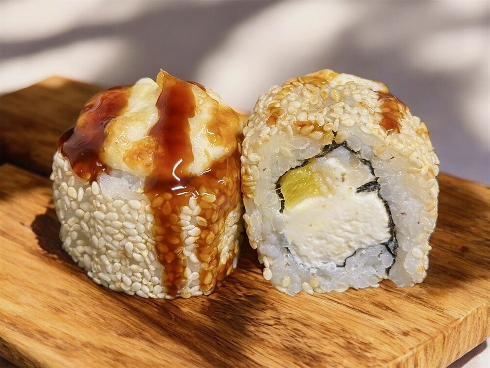 Рис, Нори, сыр сливочный, креветка, апельсин, сырная шапочка, кунжут, унаги