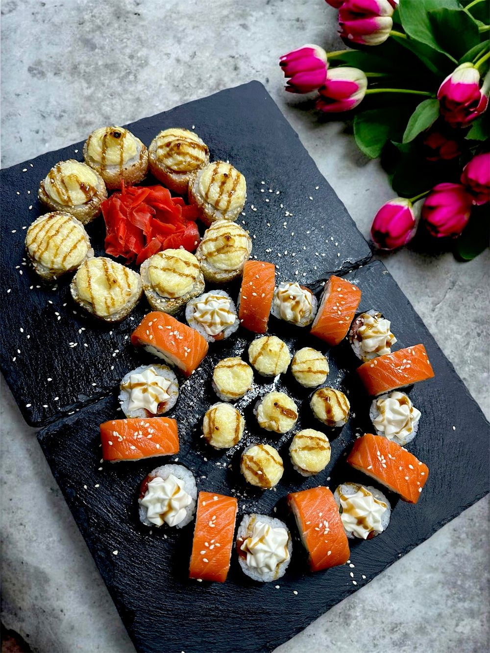 Филадельфия классика, Сегун сливочный (лосось, огурец, сливочный сыр), Цитрус-краб запеченный (имитация краба, апельсин, сливочный сыр, кунжут, сырная шапочка), Мини-маки с крабом запеченные