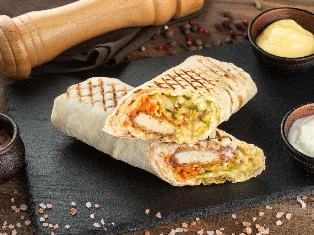 Лаваш, наггетсы, капуста белокочанная, маринованные/свежие огурцы, помидоры, морковь по-корейски, сыр, чесночный соус, кетчуп