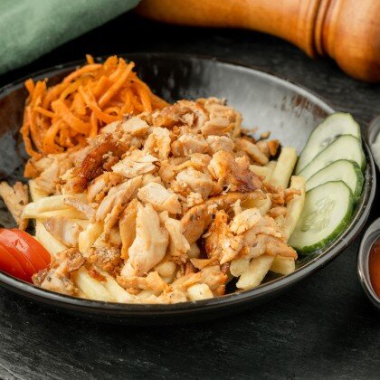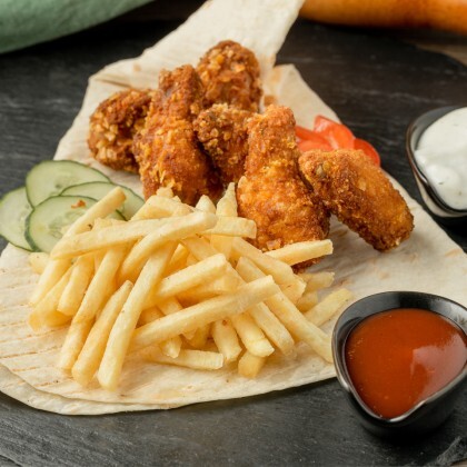 Куриные наггетсы - 5 шт , картофель фри - 100 гр , кетчуп, сырный соус