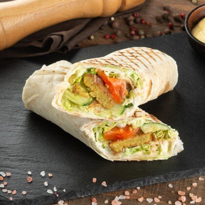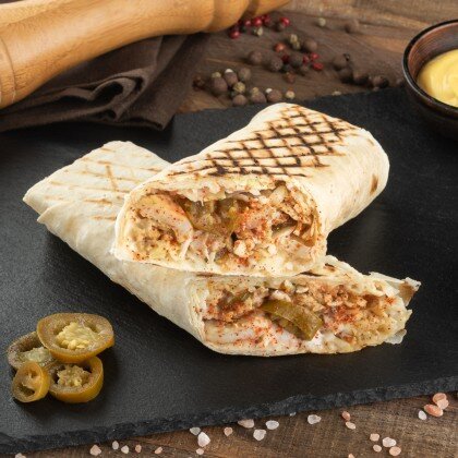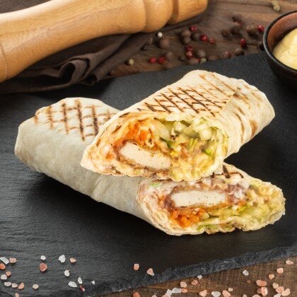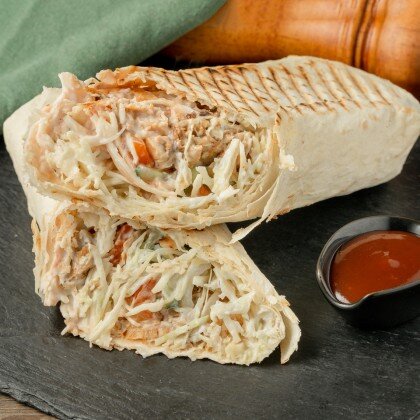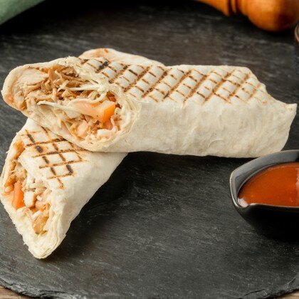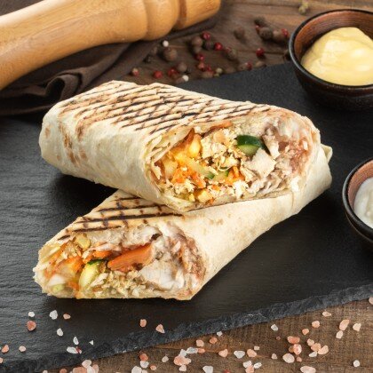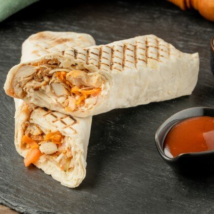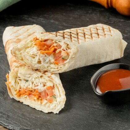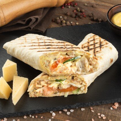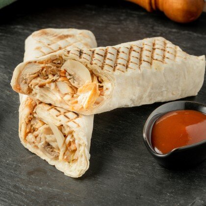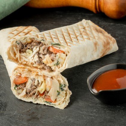 Лаваш, куриное филе, картофель фри, чесночный соус, кетчуп, маринованные/свежие огурцы, помидоры